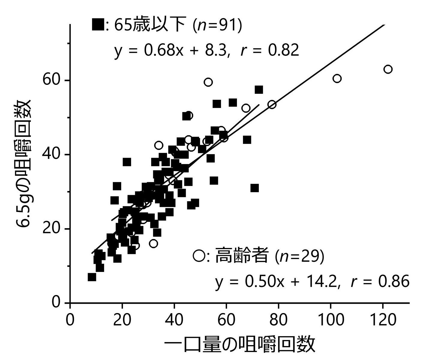 ・若年者群も高齢者群もともに、任意の一口あたりの量と規定量6.5gの咀嚼回数は個体間ではいずれも大きな差が見られました。