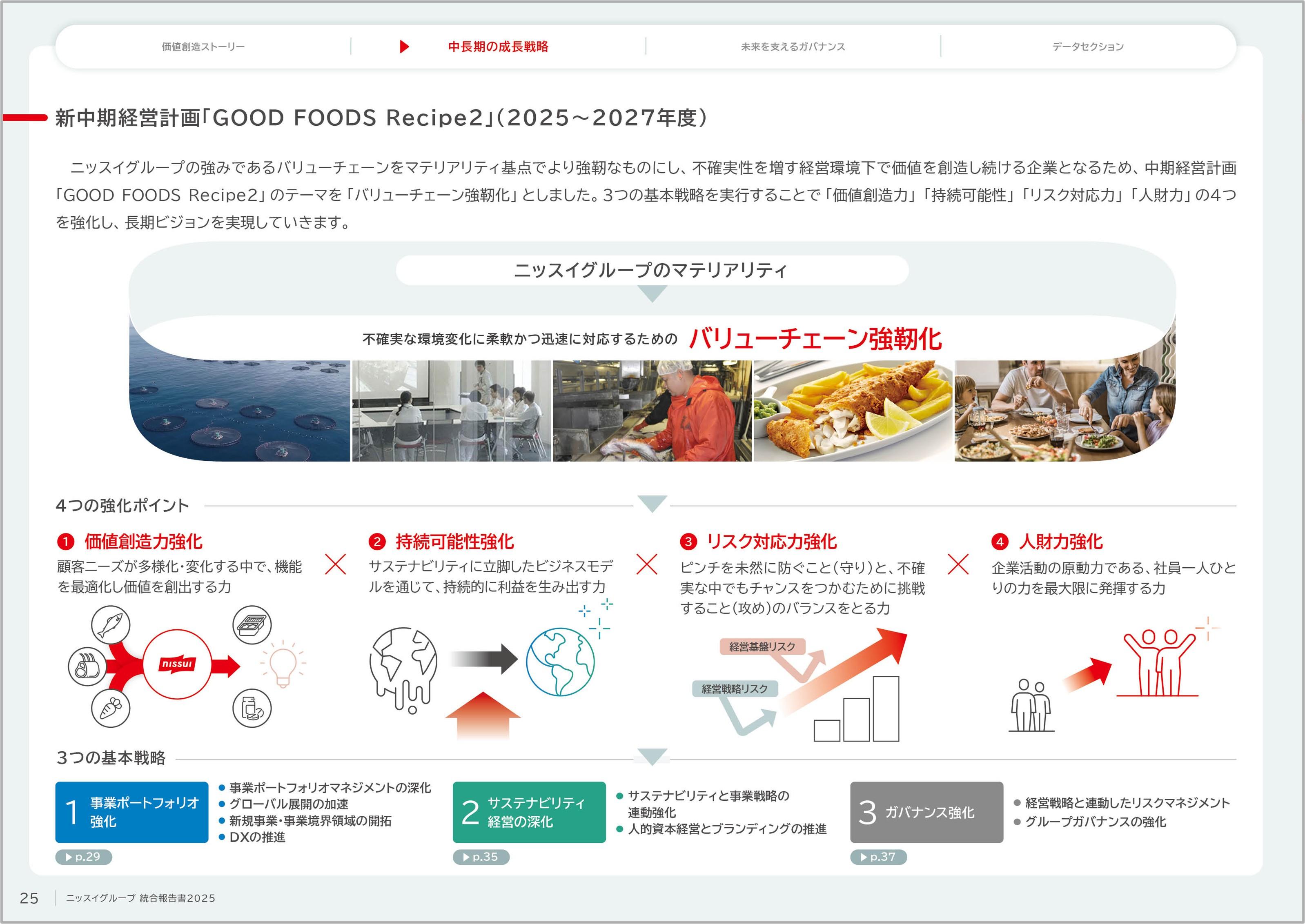 「GOOD FOODS Recipe2」では、これら4つのポイントの強化を図るため「事業ポートフォリオ強化」「サステナビリティ経営の深化」「ガバナンス強化」という3つの基本戦略を骨子としています。リスク・機会への対応方針や重要リスクの特定プロセスの整理も含め、長期ビジョン「GOOD FOODS 2030」の実現に向けたニッスイグループの中長期的な成長ストーリーを示しています。