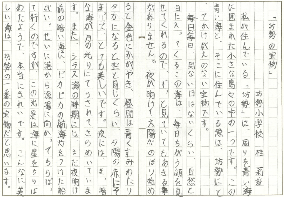 | 農林水産大臣賞 | 坊勢の宝物 | 作文 | 桂 莉愛 | 5 |
