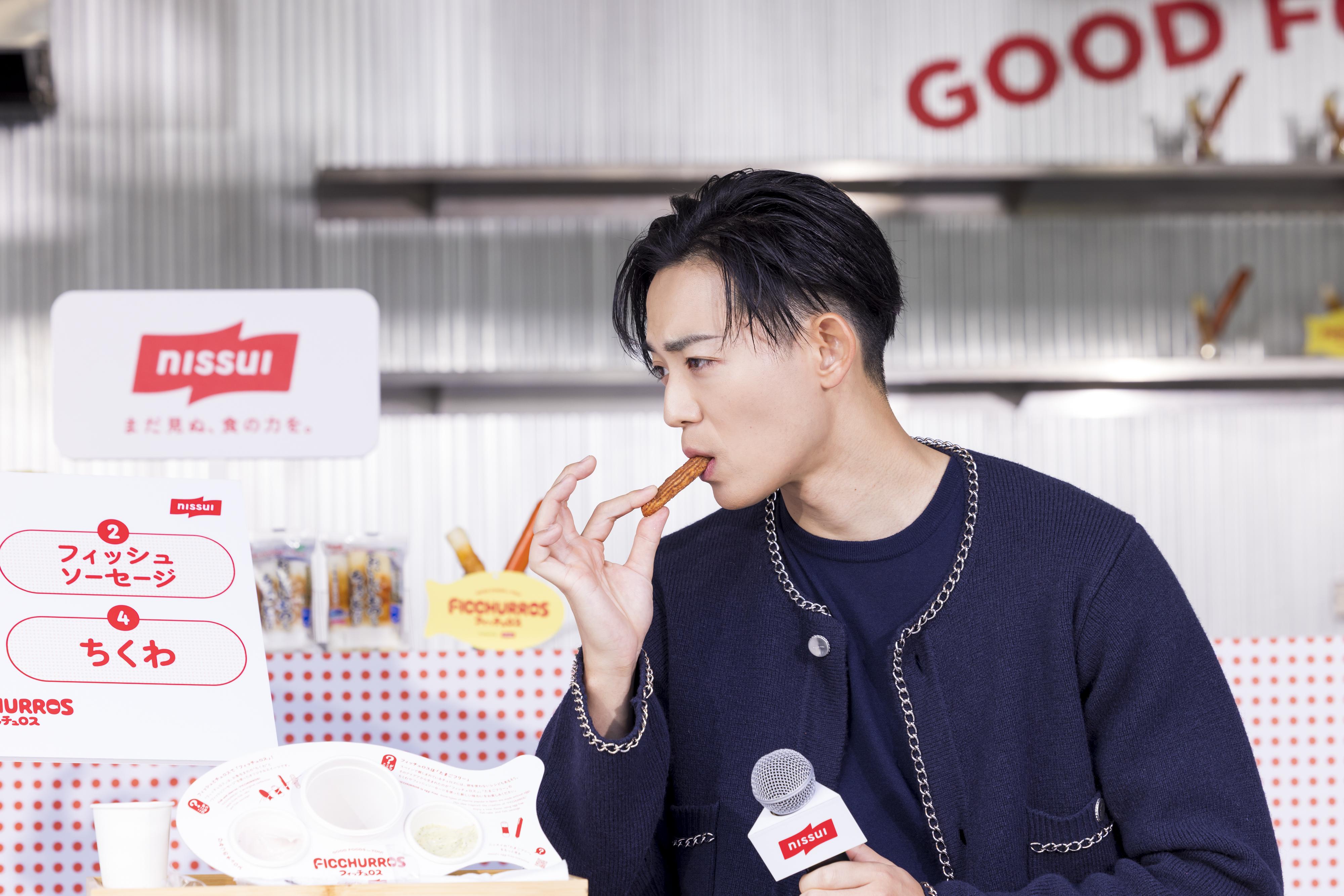 「『フィッチュロス』にはもう一つ"ひみつ"があります。それは、卵を使用していないことです。スペインで親しまれているチュロスには、卵を使わないレシピもあるそうで、そのアイデアから生まれたのが『フィッチュロス』です。使用している『ちくわ』や『フィッシュソーセージ』も、もちろん卵を使っていません。通常、フィッシュソーセージやちくわなどのねり製品には、卵は欠かせない食材ですが、ニッスイの製品には、みんなで同じものが食べられるように、という思いから、卵を一切使用していないんです」とニッスイの担当者はコメント。それを聞いた竜星さんは、「卵を使わずに...!すごいですね?実際に言われてみないと、卵を使っていないことはわからないです!」と、ニッスイの食に対する思いに感心している様子でした。