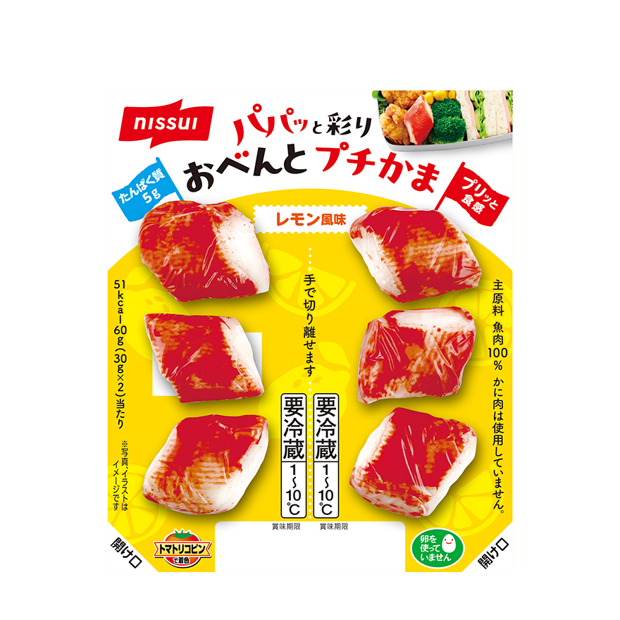 - 1個10gのお弁当にぴったりサイズの、レモン風味のカニ風味かまぼこです。