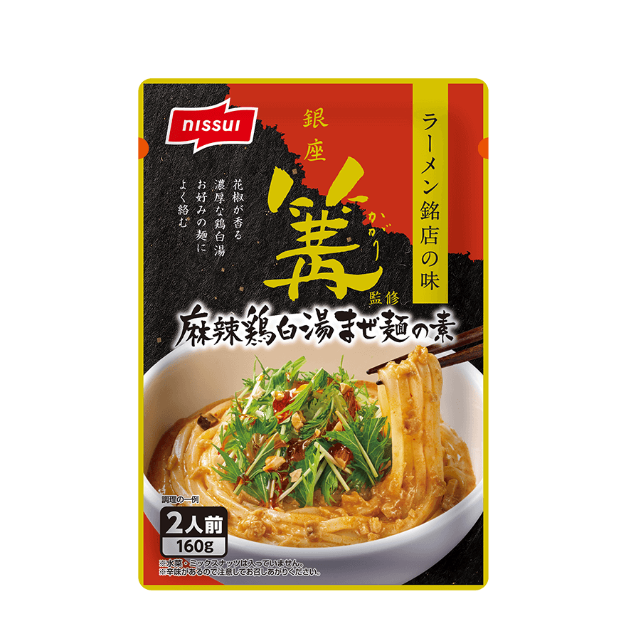 - 人気ラーメン店「銀座 篝(かがり)」監修、麻辣鶏白湯味のストレートタイプのまぜ麺の素です。