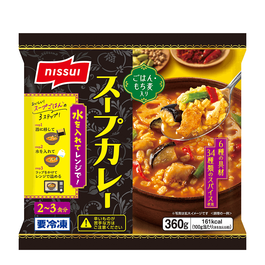 - 34種類のスパイスを使用したスープにもち麦入りのごはんを加えた、本格的なスープカレーです。
