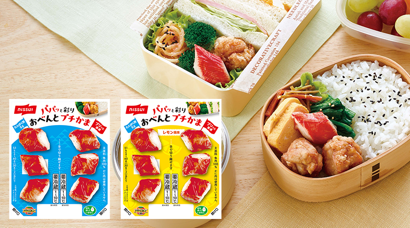 「おべんとプチかま」は、お弁当に彩りを添え、家族の健康にも配慮した、カニ風味かまぼこです。2種の味わいで、毎日のお弁当作りをサポートします。