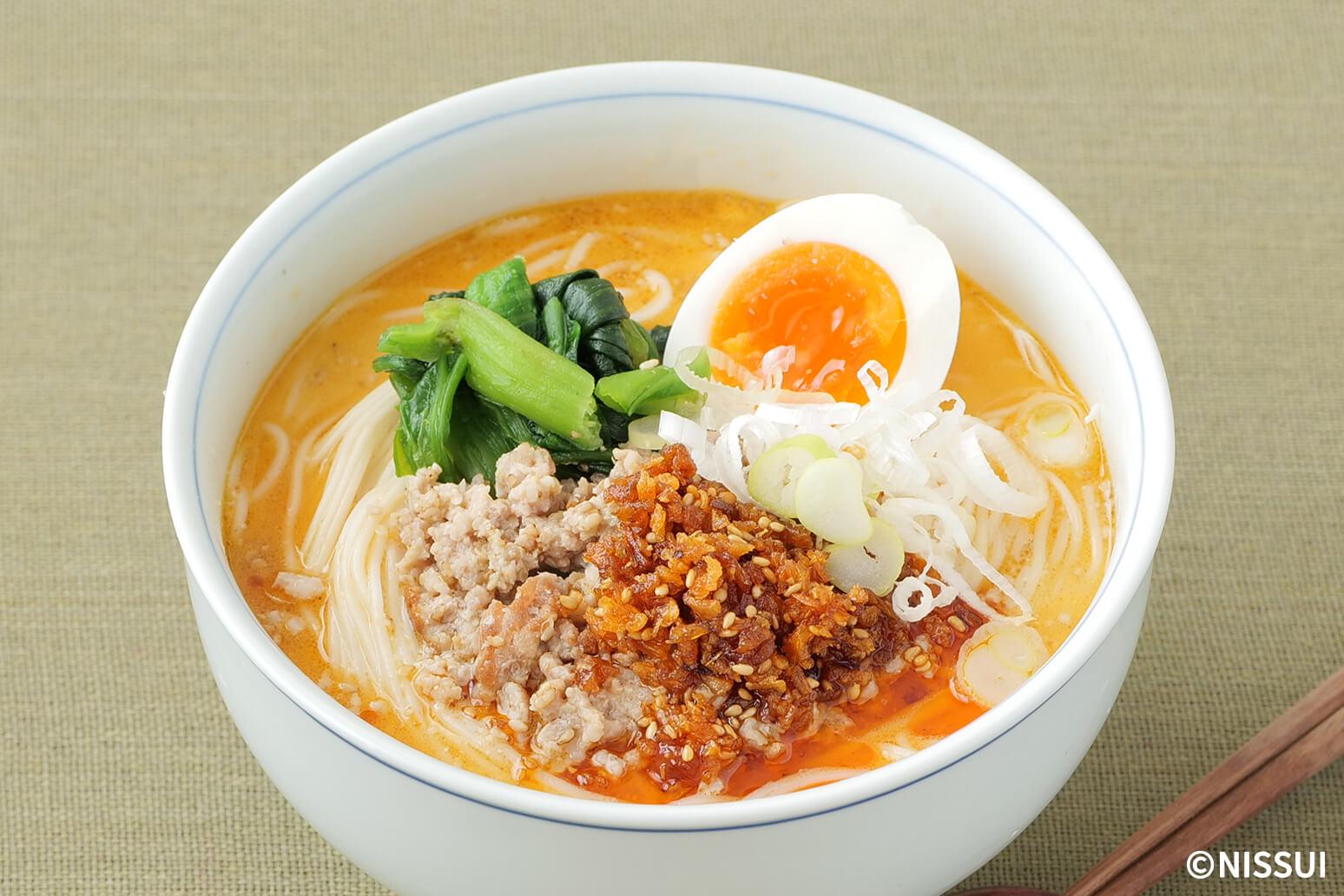 濃厚なごま味噌豆乳スープにザクザク食感が美味しい「ザクザク食べるラー油 えび花椒」を加えたうま味たっぷりの担々にゅうめんです。えびの旨みと花椒の香りでぐっと本格的な味わいに。