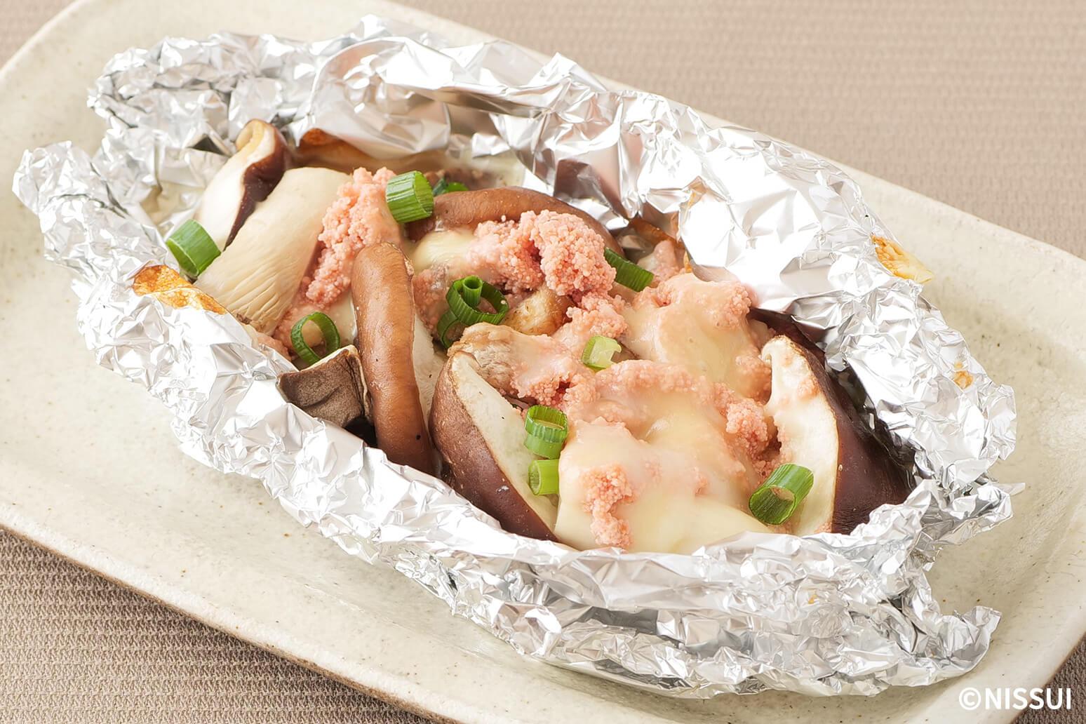 きのこのうま味と「たらこほぐし」のうま味が重なった一品。ホイルを開けた瞬間、ふわっと広がる香りがたまりません。
