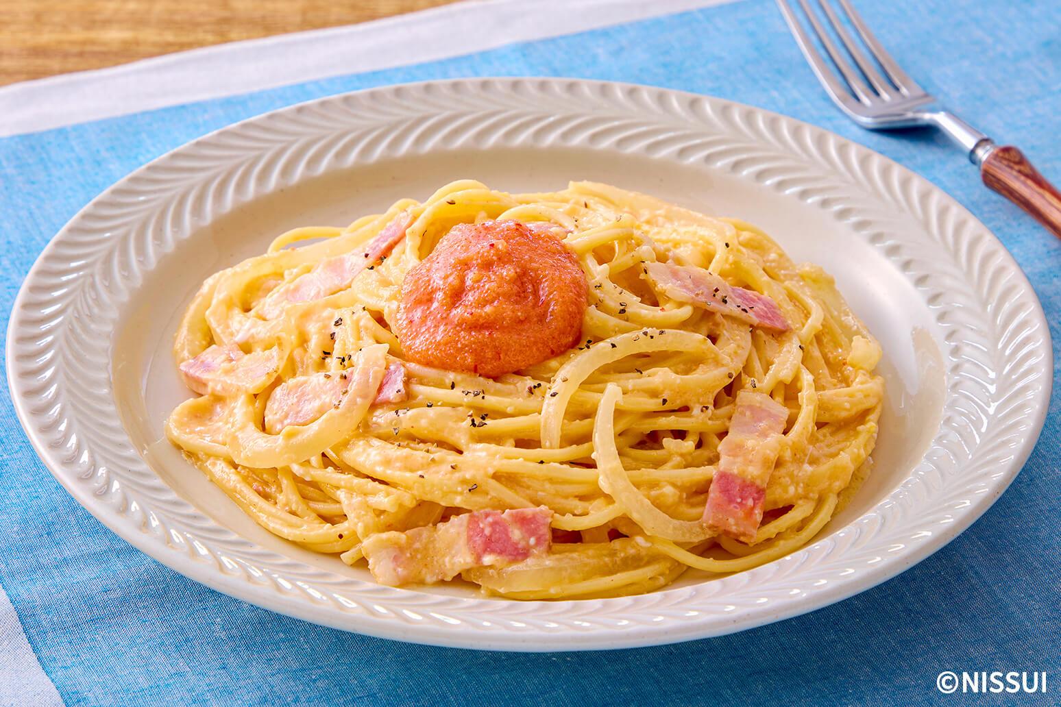 明太子の辛味がくせになる、濃厚なカルボナーラ。フライパンだけで作るので、ベーコンや玉ねぎの旨みがスパゲッティに染み込みます。