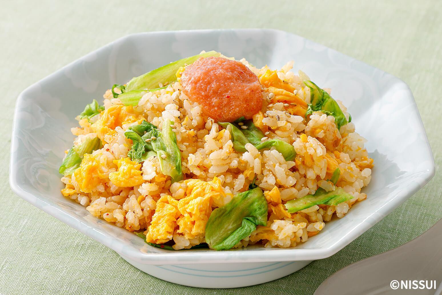 プチプチの明太子と、シャキシャキのレタスの食感が楽しめ、包丁要らずで手軽に作れるチャーハンです。