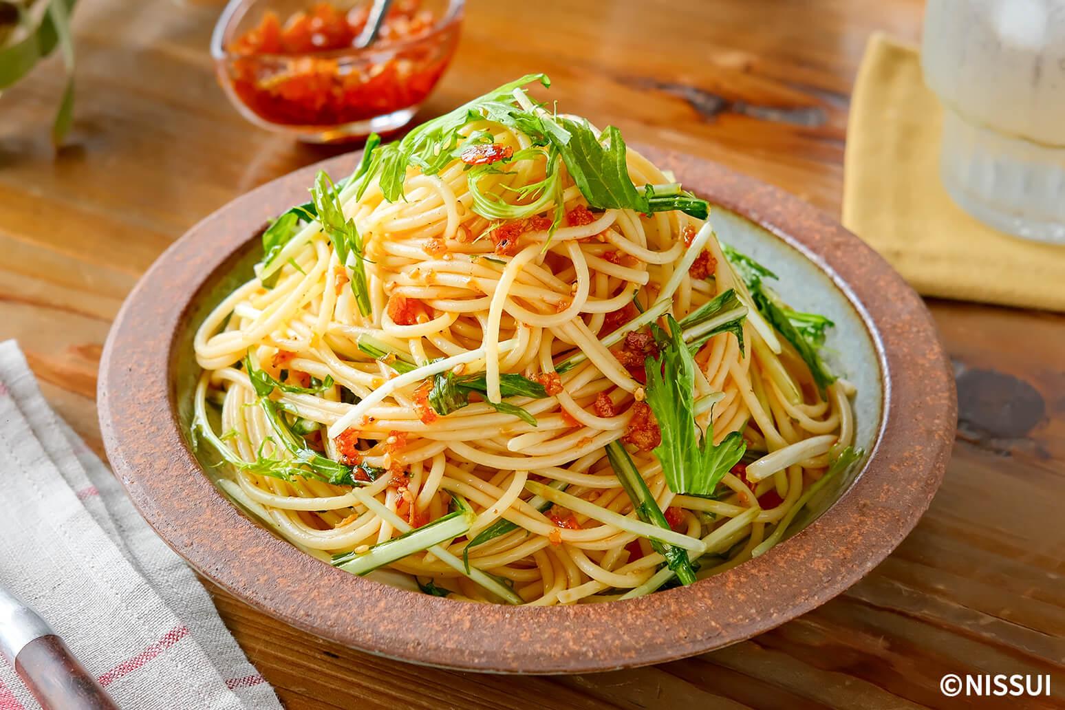 えび花椒のうま味と風味がしっかりきいた、簡単で美味しいパスタです。ザクザクのラー油とシャキッとした水菜の相性も良く、サラダ感覚でペロリといただけます。