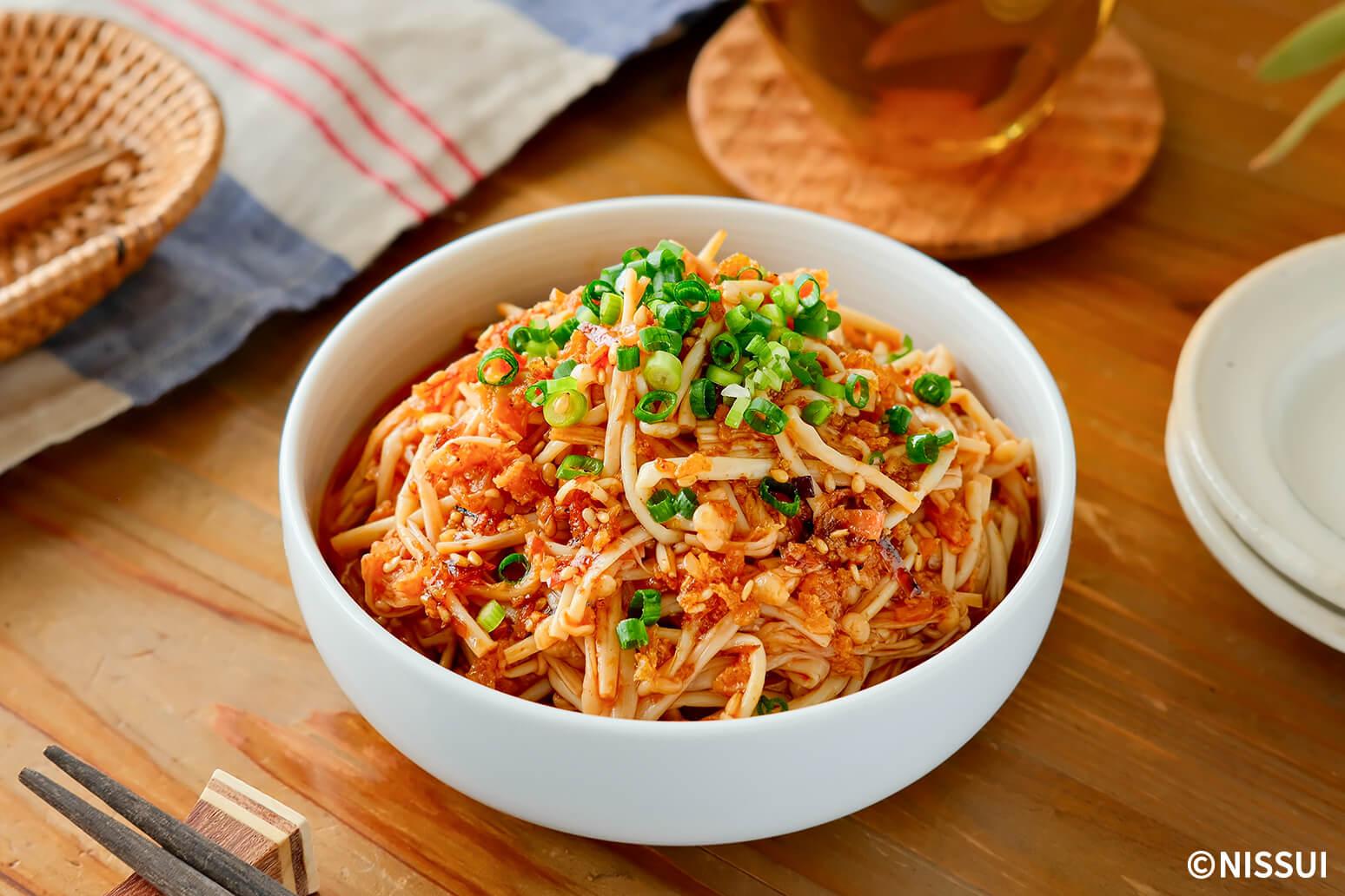 えのきとザクザクラー油の食感、コチュジャンの甘辛さにやみつき!ビール、焼酎、日本酒と相性抜群です。しかも調理は電子レンジでOK。簡単すぎてますますやみつき⁉