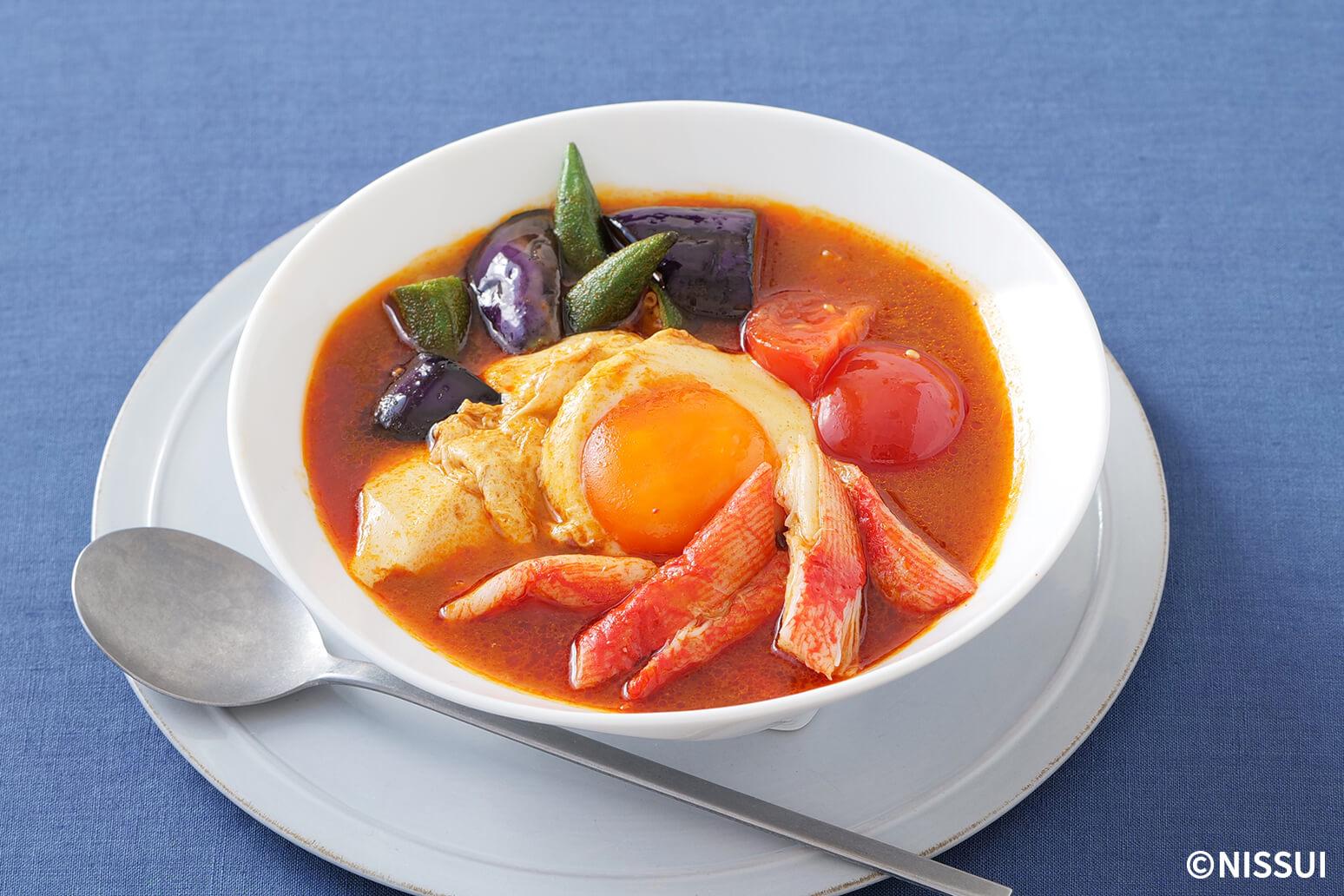 トマト、卵、「海からサラダフレーク」を加え、卵がお好みの固さになるまで煮込んだら、器に盛り付ける。