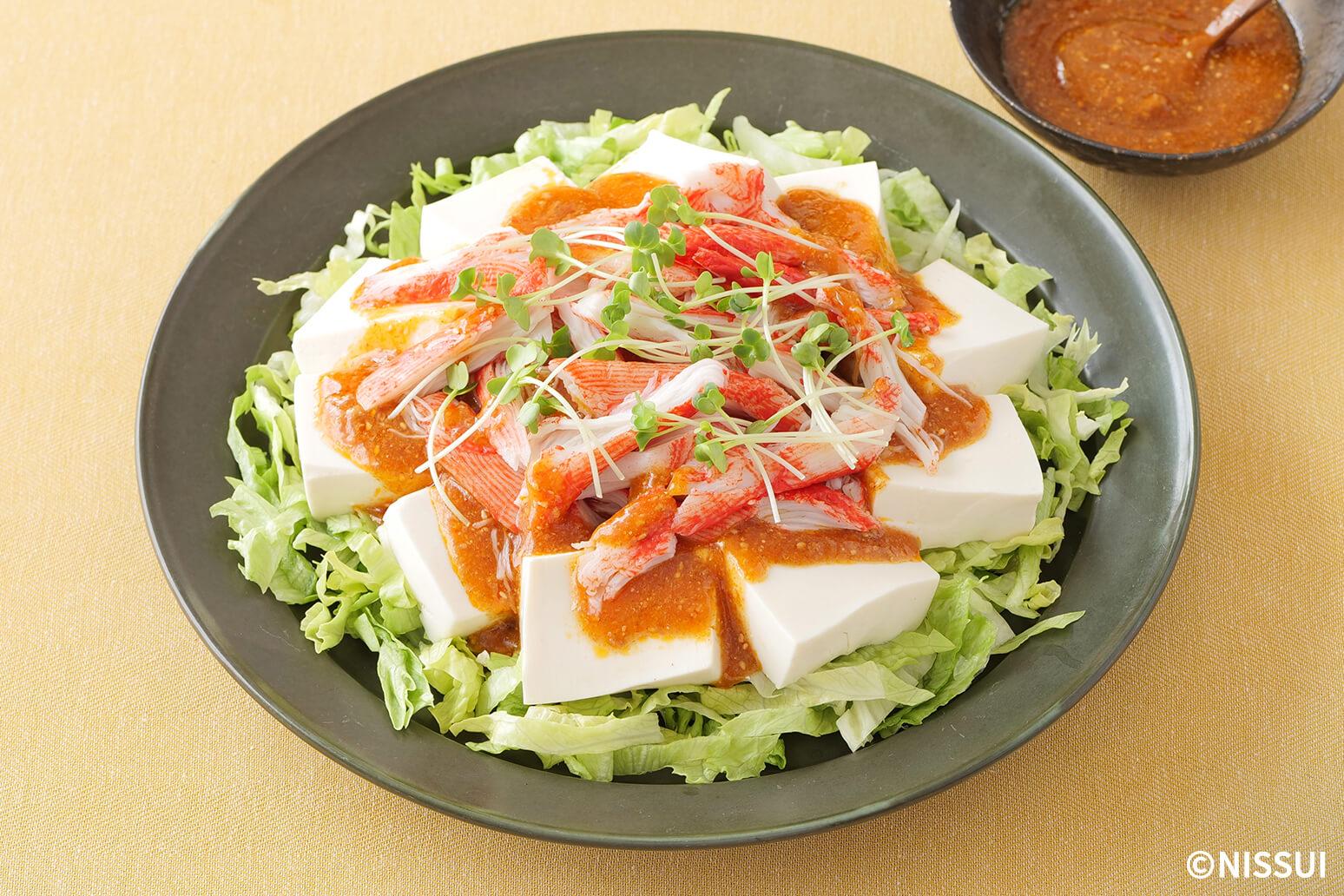 シャキシャキとしたレタスと、豆腐のやさしいボリューム感が楽しめる一品。海サラダフレークのうま味とコクのある麻婆豆腐の素の味わいとが相性抜群です。