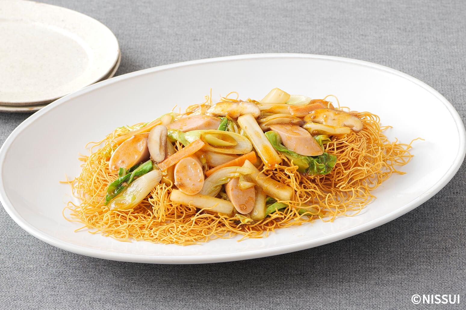 パリパリ食感が楽しい皿うどんに、麻婆豆腐の素で手軽に仕上げた野菜たっぷりのあんを合わせました。おさかなのソーセージのうま味が全体に広がり、コクのある味わいを楽しめます。