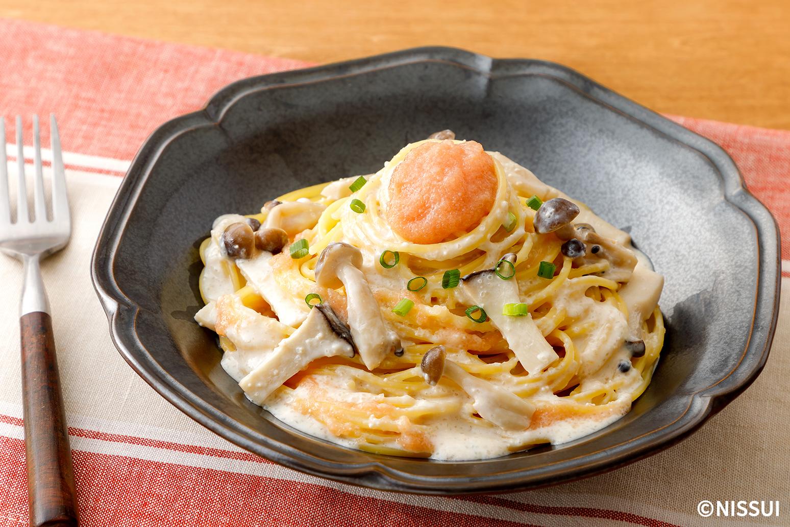 王道のたらこクリームパスタを、ワンパンで手軽に。たらこときのこの旨みがぎゅっと詰まっています。