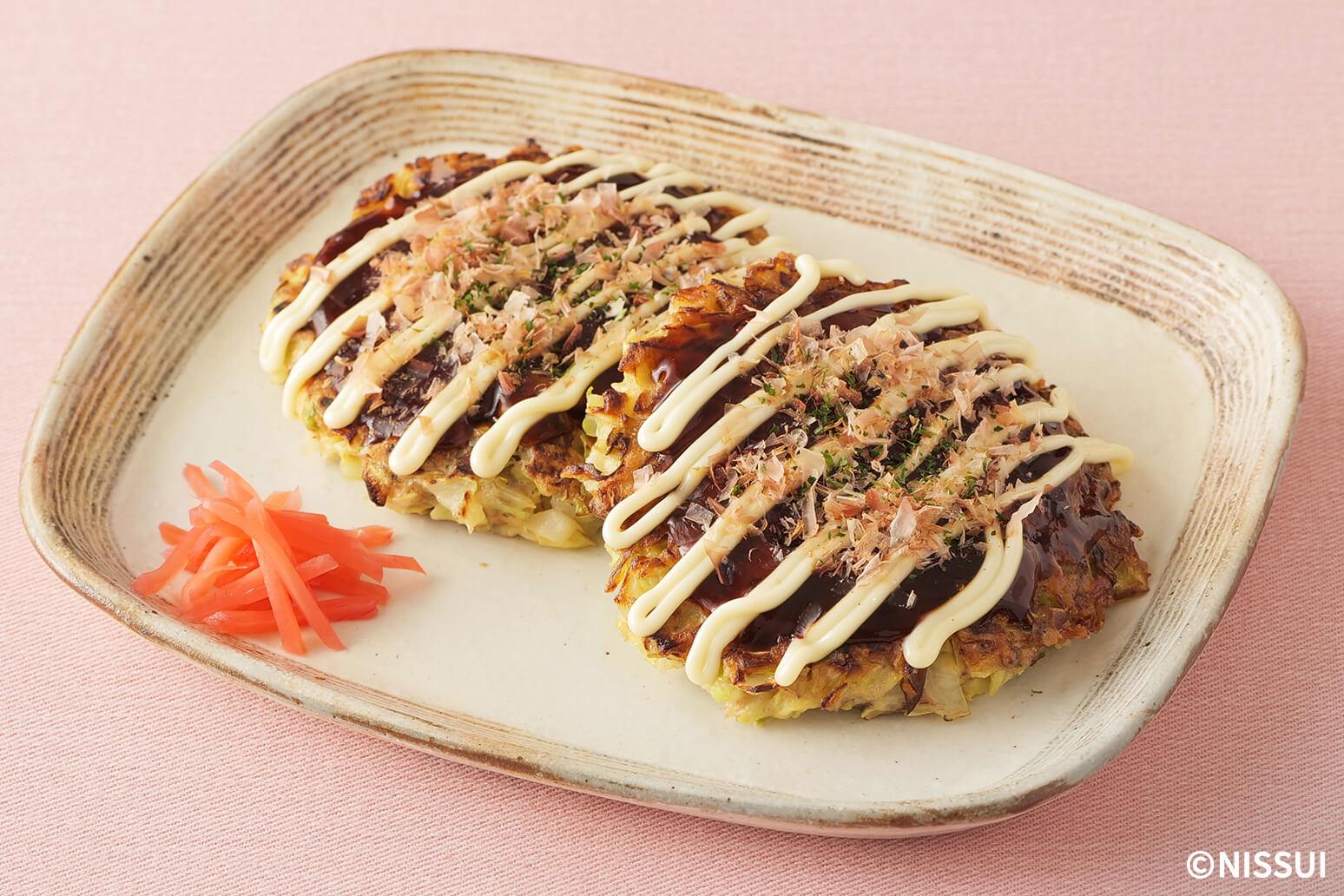 ふんわりとした食感で、さばの身がしっかり感じられるお好み焼き。さばの缶汁を使い、うま味をプラスしています。