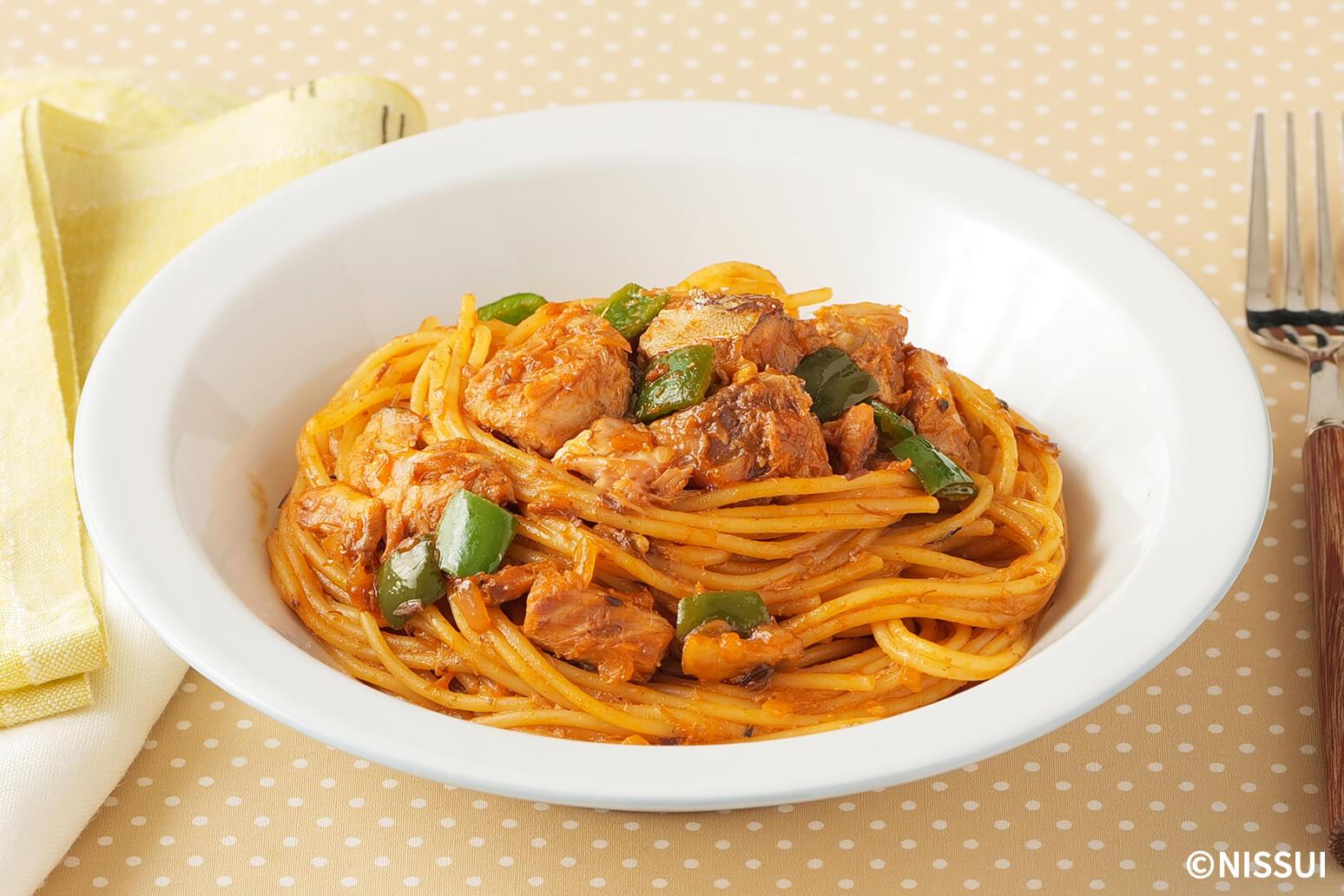 ナポリタンソースにさばのうま味を合わせた一品。醤油や酒を加えることで、まろやかで食べやすい味わいに仕上げています。