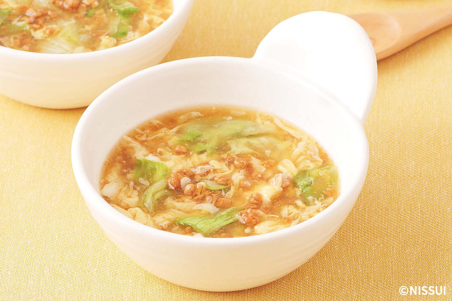 「とりそぼろ」のうま味と甘みを活かした、中華仕立ての満足スープ。とろとろの卵とシャキシャキのレタスが、スープの味わいを引き立てます。