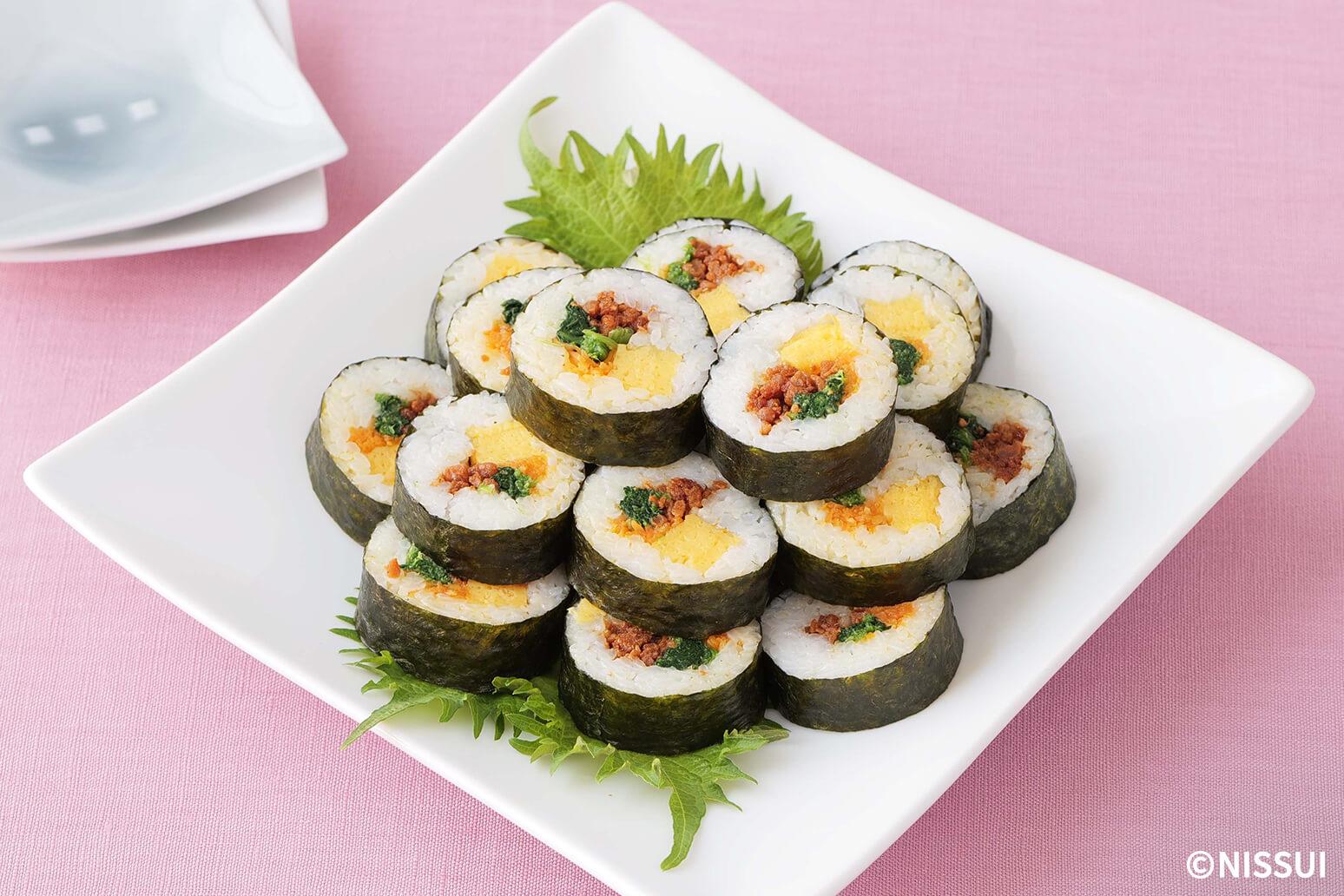巻きすに焼きのりをのせ、ごはんの半量を手前3/4に広げたら、「とりそぼろ」、(1)(2)と厚焼きたまごを順に並べ、手前から巻いて形を整える。