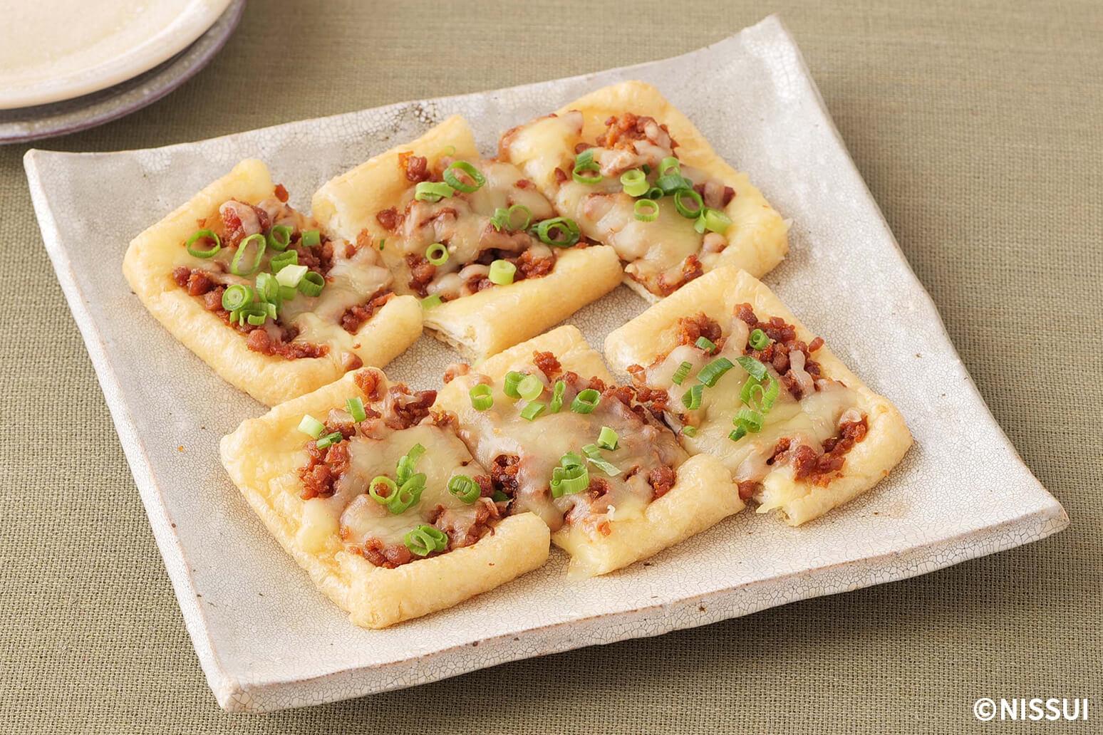 油揚げにのせた「とりそぼろ」のうま味とチーズのコクが調和した、満足感のある一品です。手軽に作れ、おつまみにもぴったりの美味しさです。