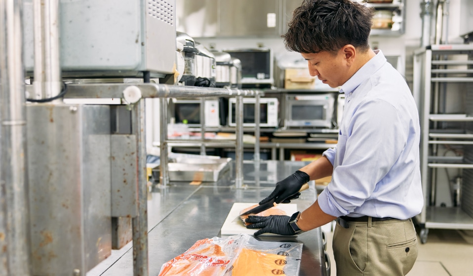 より安全・安心な品質の水産物を調達するために、国内外の陸上もしくは洋上(船上)の水産加工場に足を運び、水揚げされた魚の加工・保管に関する業務を担当します。水揚げや加工、鮮度保持等の水産加工に関する幅広い技術の指導を行うこともあります。サプライチェーンの最上流で、製品の品質を確保する役割を担っています。