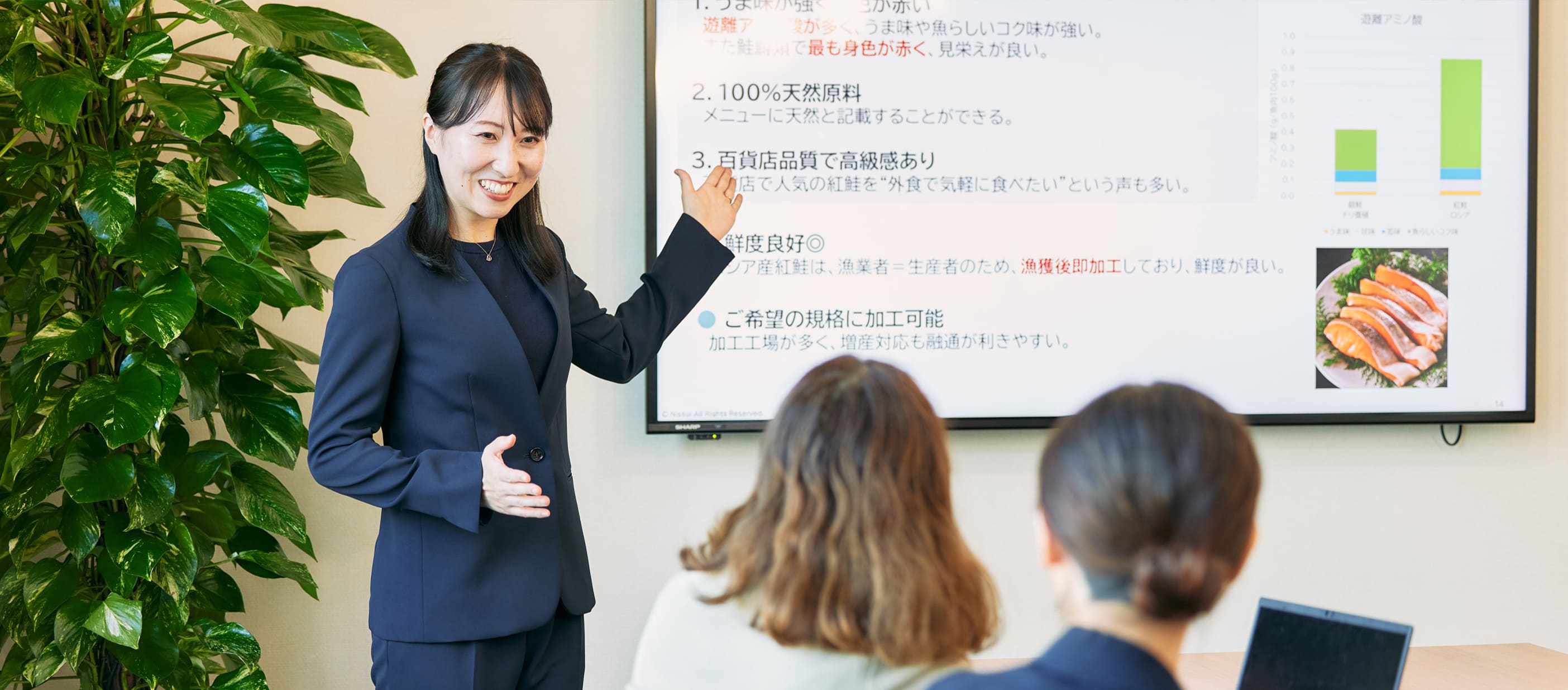 お取引先さまの会社を訪問。新規メニューや食材・既存商品のブラッシュアップを提案。市場動向などの情報を提供
