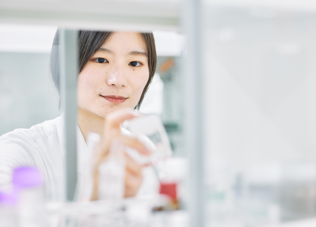 研究室ではテーマごとに数名のチームで実験を進めています。私はリーダーに次ぐ立場として自分なりに考えた実験を行いつつ、後輩のサポート役も担っています。実験で必要とされる科学的な思考と、生活者のニーズや健康意識に関する調査など人文・社会的な思考のどちらも鍛えられるところに面白さを感じます。また、3カ月に1回、事業部との定期会議があり、実験内容の共有や開発の進捗報告を行います。その際、事業部側の視点でのアドバイスとともに、展示会やお取引先さまとの商談などで社外に研究成果を紹介する機会をもらうことがあります。私も展示会でメーカーの方々の前でプレゼンテーションを行った経験があります。緊張しましたが非常に貴重な経験となりました。現在扱っている素材はまだ研究段階ですが、今後、事業化・製品化を実現し、多くの人に知られる存在に育てることを目標に日々の実験に取り組んでいます。