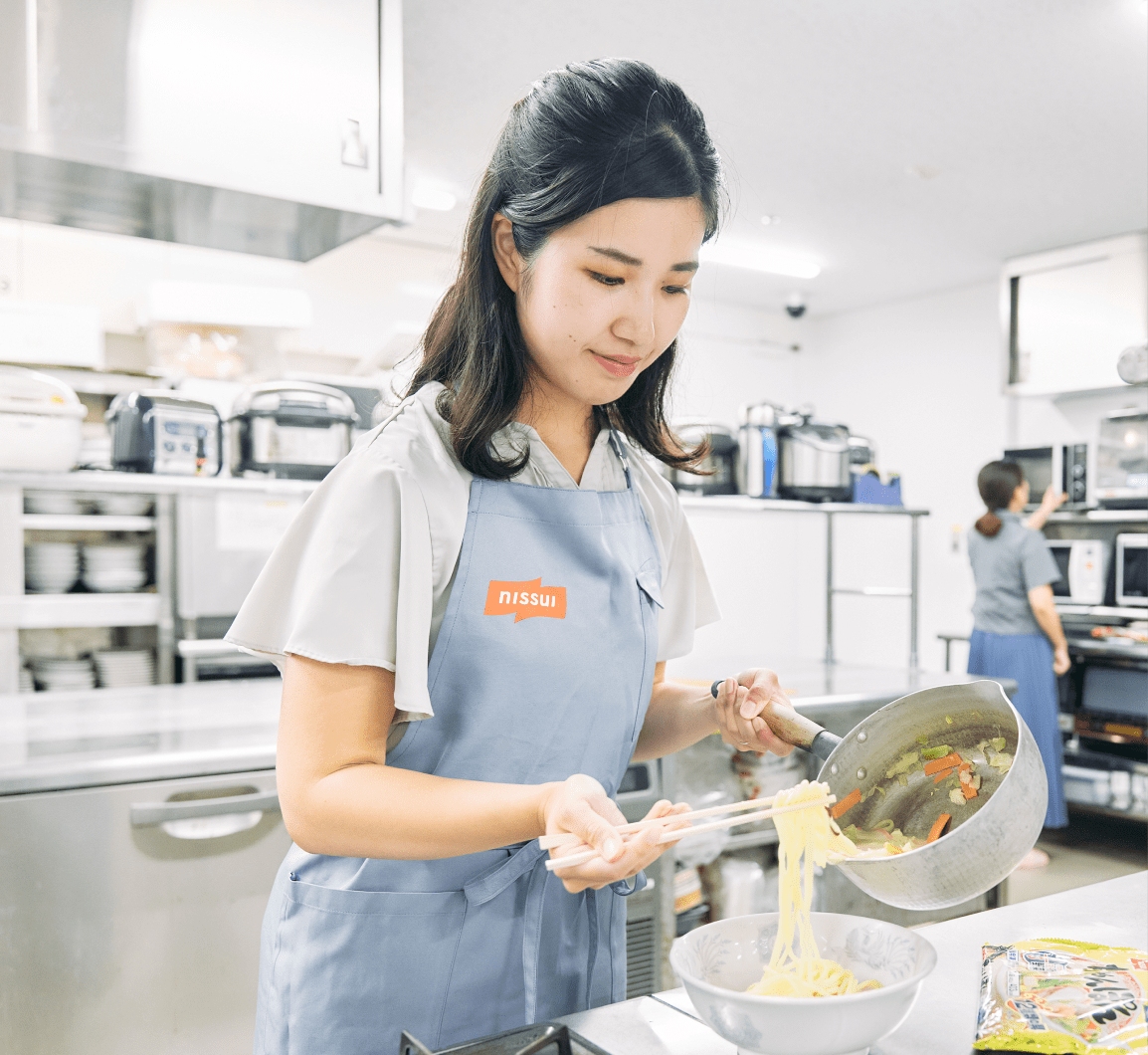 もともと食べることが好きで、高校は調理師免許が取得できる学校に進学しました。将来は食品メーカーなどで食の素晴らしさをより多くの人に届ける仕事がしたいと考えていました。また、大学ではコミュニケーション分野を学んだことで、さまざまな人と接する営業という職種に興味をもちました。ニッスイについては、家庭用冷凍食品「大きな大きな焼きおにぎり」と「ほしいぶんだけ ちくわの磯辺揚げ」が昔から好きで、身近な存在でした。また、就職活動中に参加したニッスイの社員座談会では、先輩方がとても楽しそうに会話している姿が印象的でした。その姿を見て、この人たちと一緒に働きたいと思ったことが入社を決めた一番の理由ですね。