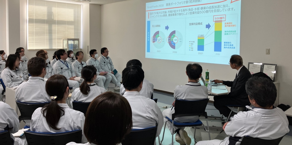 社員と経営が長期ビジョン実現に向けた取り組みを直接的なコミュニケーションを通して共有することで、自発的な行動の促進と全社一体感を醸成することを目的としています。(国内グループ会社も対象)